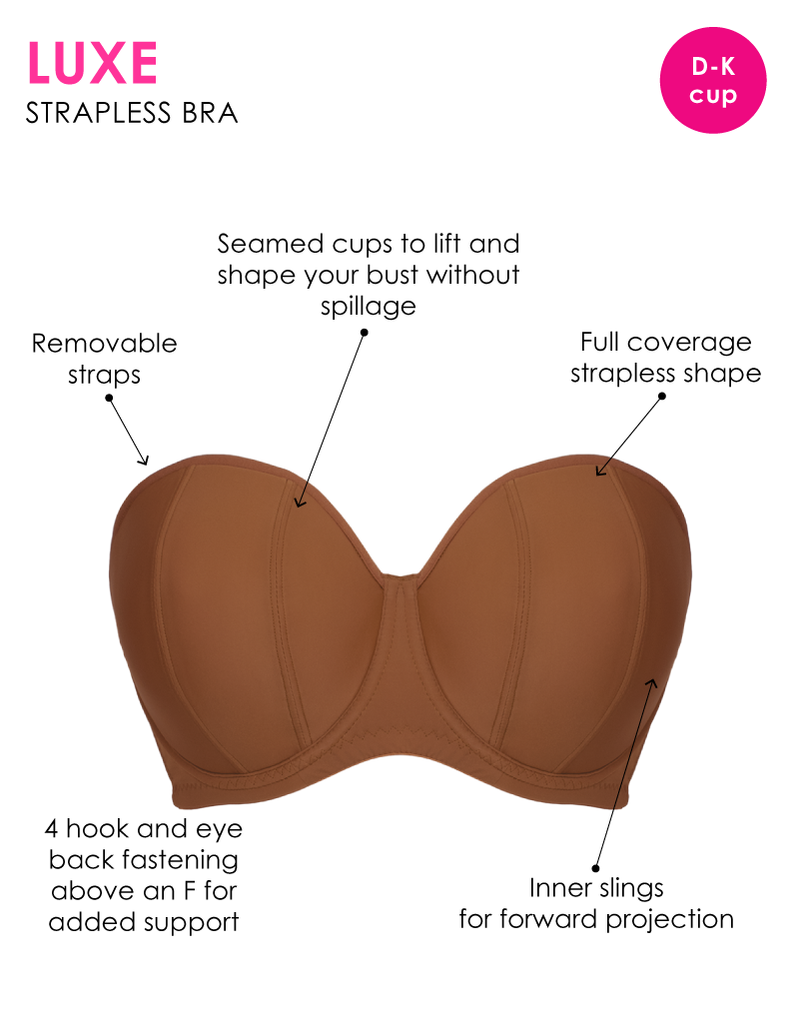 'Best Supporting Act' goes to... The award winning Curvy Kate Luxe Caramel Strapless Bra! This is the best strapless made for big boobs – the seamed cups offer lift and shape, as the band hugs your curves without the worry of slipping.