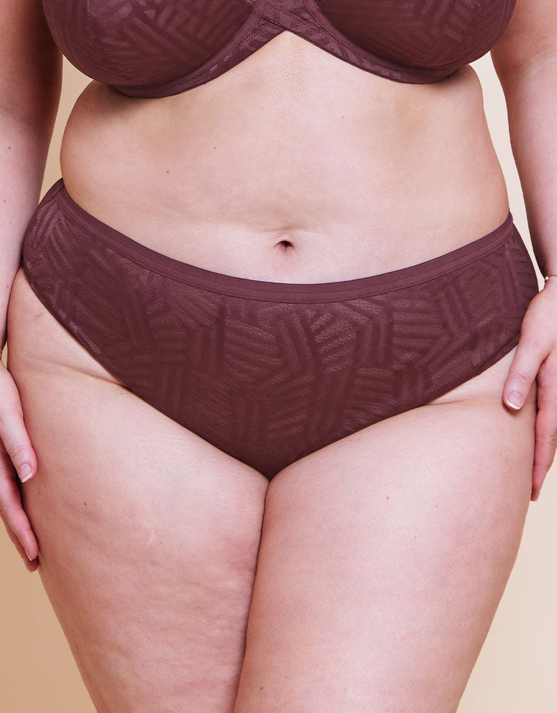 Everyday comfort just got easy with Curvy Kate's WonderFull Vibe High Leg Brief, now in a deep auburn brown. The high rise, fuller coverage cut is flattering as it hugs your curves, and offers total comfort too. Made from all over stretch lace in an abstract geometric pattern with breathable sheer mesh.